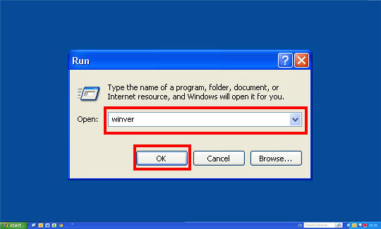 3. When the Run box appears type the word WINVER in the empty white box (highlighted in red). Then click on the [OK] button (highlighted in red).